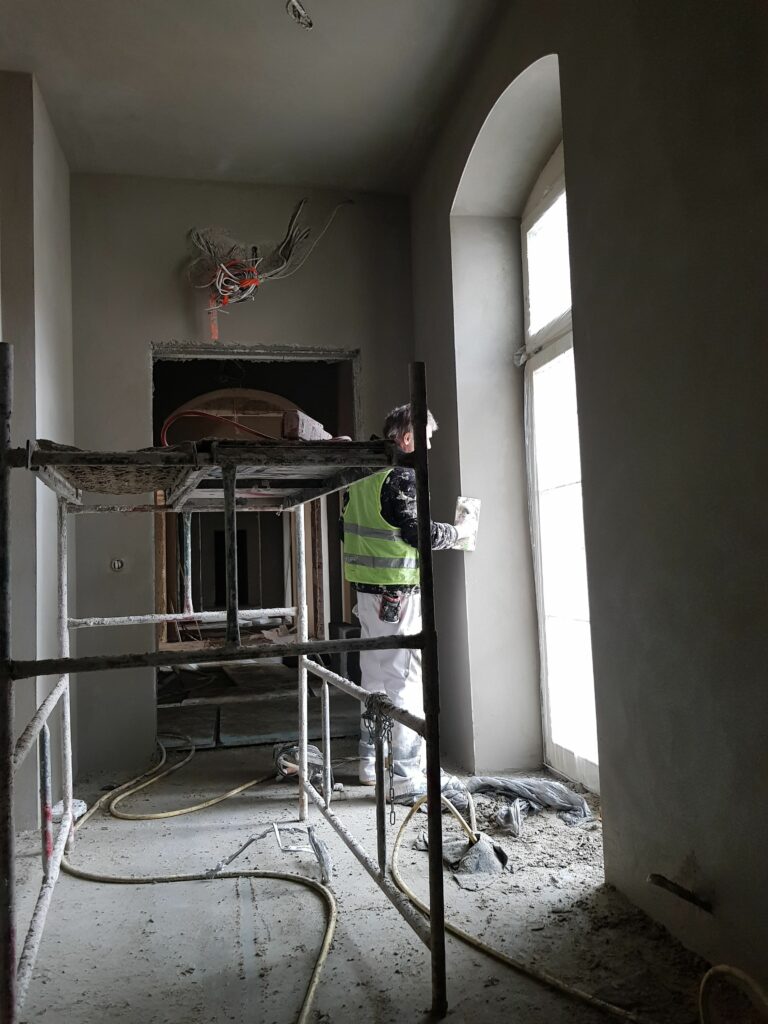 Wykonanie tynków maszynowych cementowo-wapiennych w zabytkowym budynku w inwestycji Ogrody Graua. Wrocław ul. Sopocka
